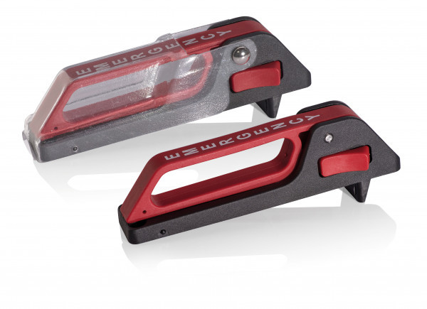 Maniglia interna per porte di uscita di emergenza, con azionamento indiretto per mezzo di cavo Bowden.